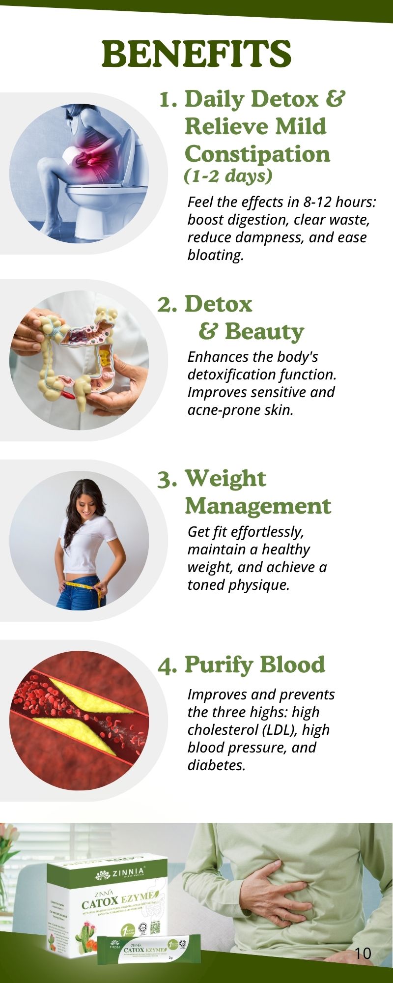 Taking ZINNIA CATOX EZYME helps with slimming and body shaping. Through detoxification and removal of excess moisture, even if your weight doesn’t decrease, your body shape will become lighter and more toned.