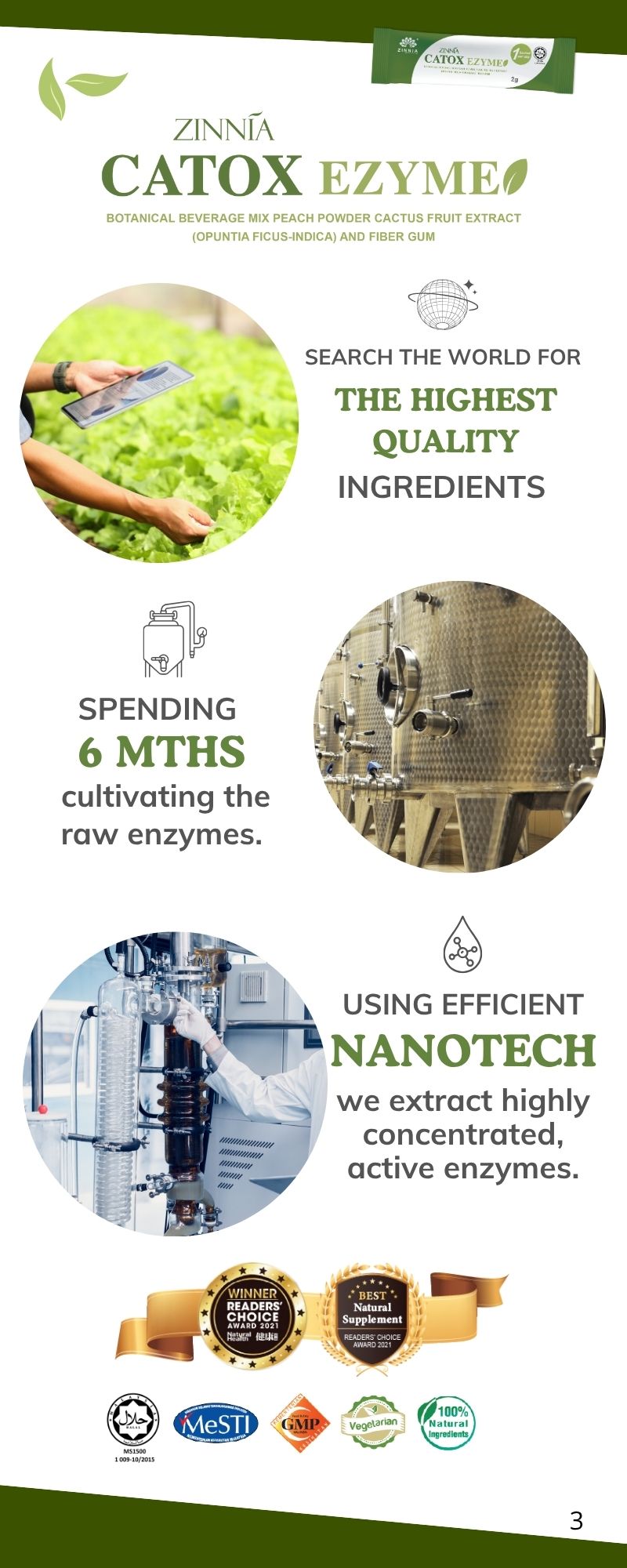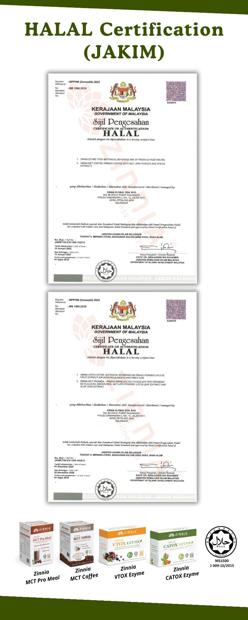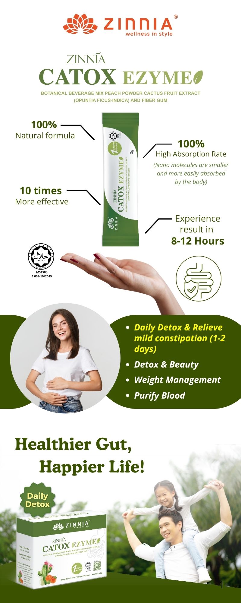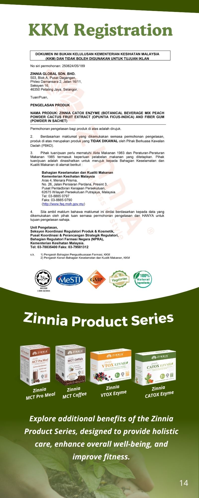 ZINNIA CATOX EZYME is made with a unique improved formula and high-quality enzymes, ensuring long-term consumption without side effects. It follows strict quality control guidelines, free from animal ingredients, harmful chemicals, and prohibited substances. It is tested, approved, and certified by the Ministry of Health Malaysia (KKM) and has been granted a HALAL certificate by the Department of Islamic Development Malaysia (JAKIM).