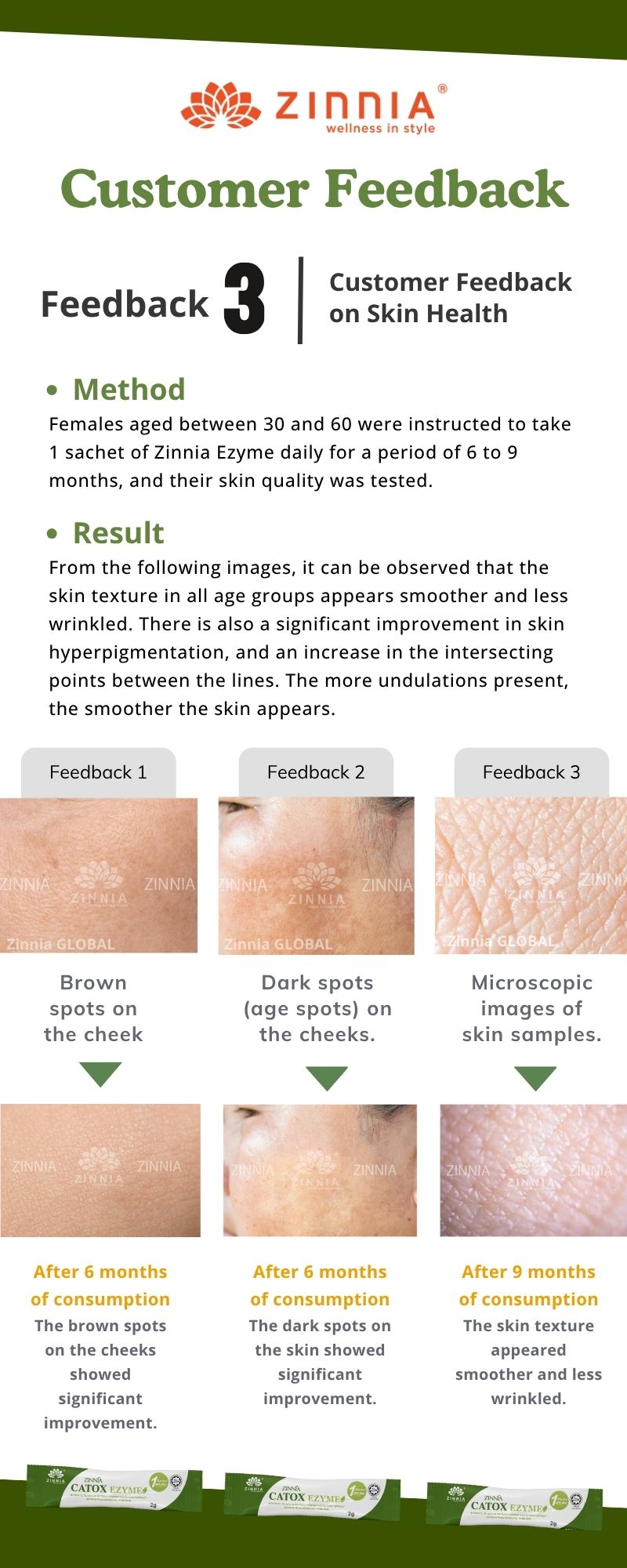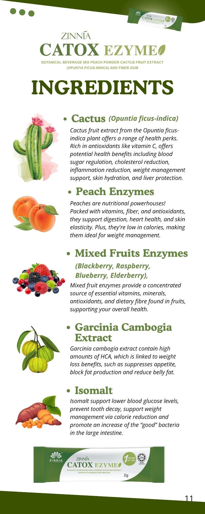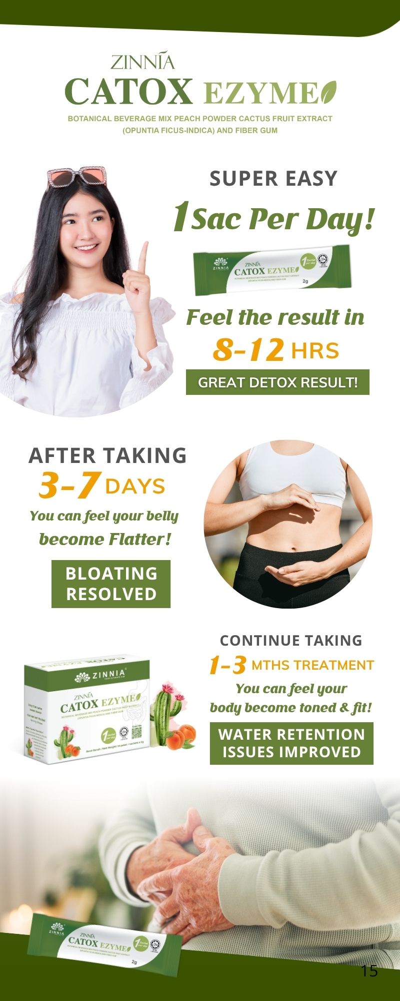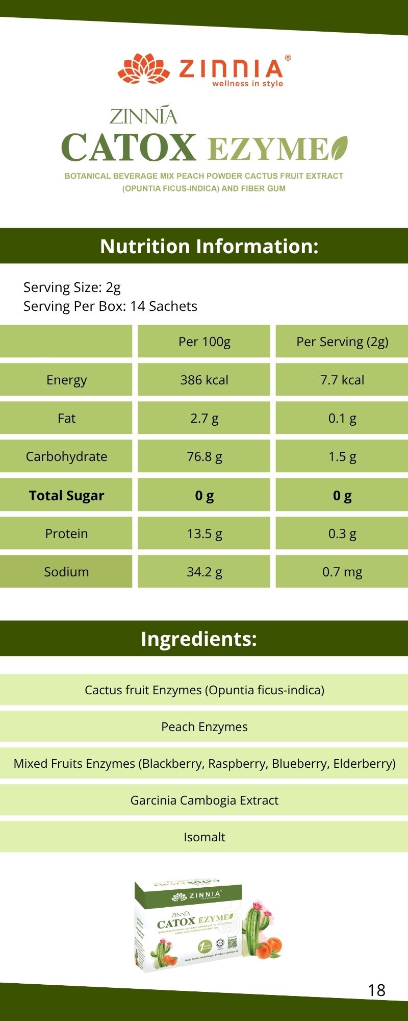 ZINNIA CATOX EZYME is made with a unique improved formula and high-quality enzymes, ensuring long-term consumption without side effects. It follows strict quality control guidelines, free from animal ingredients, harmful chemicals, and prohibited substances. It is tested, approved, and certified by the Ministry of Health Malaysia (KKM) and has been granted a HALAL certificate by the Department of Islamic Development Malaysia (JAKIM).