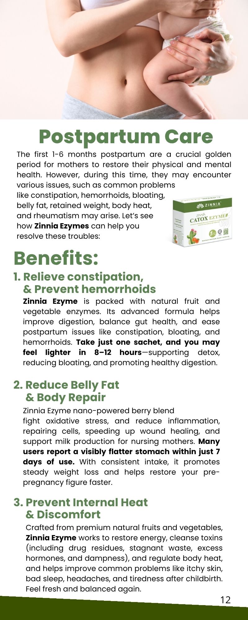 During the postpartum recovery period and while breastfeeding, it's crucial to take care of your body, especially when it comes to replenishing blood and maintaining a balanced diet. A balanced diet, including high-quality protein, is recommended to support postpartum recovery and promote milk production. It is generally safe to take ZINNIA CATOX EZYME in moderate amounts during the postpartum recovery period. However, for breastfeeding mothers, it is advised to wait for a 2-hour interval between taking ZINNIA CATOX EZYME and breastfeeding.