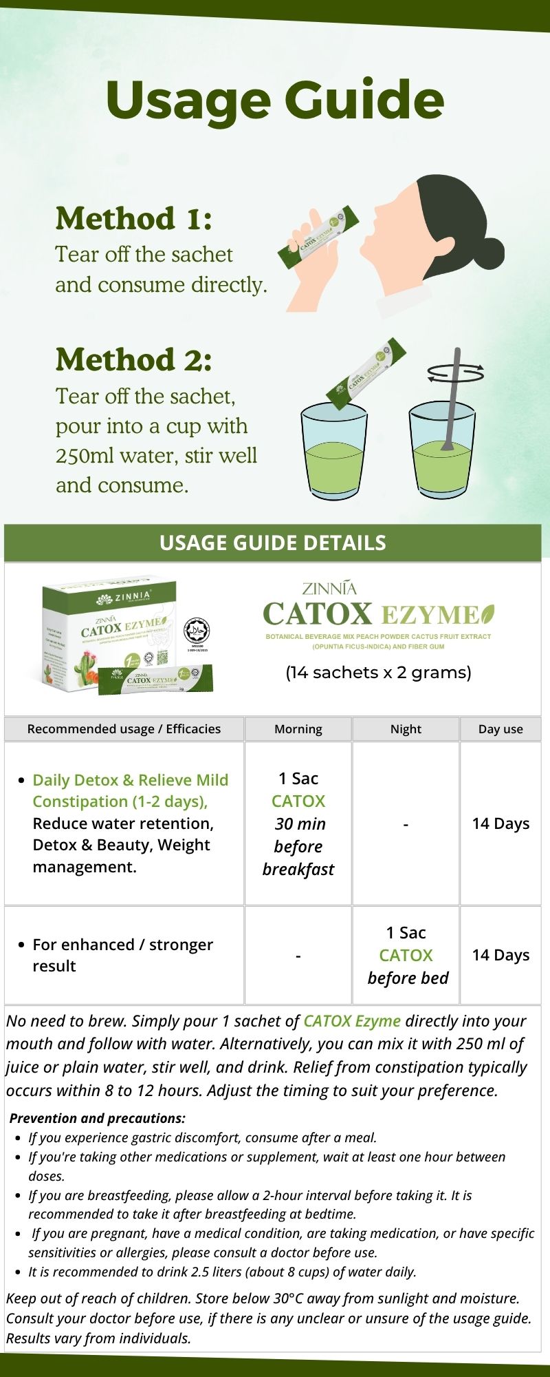 It is recommended that you drink at least 100ml of water after taking ZINNIA CATOX EZYME powder directly to avoid the enzyme remaining on the tongue, causing soreness and pain.