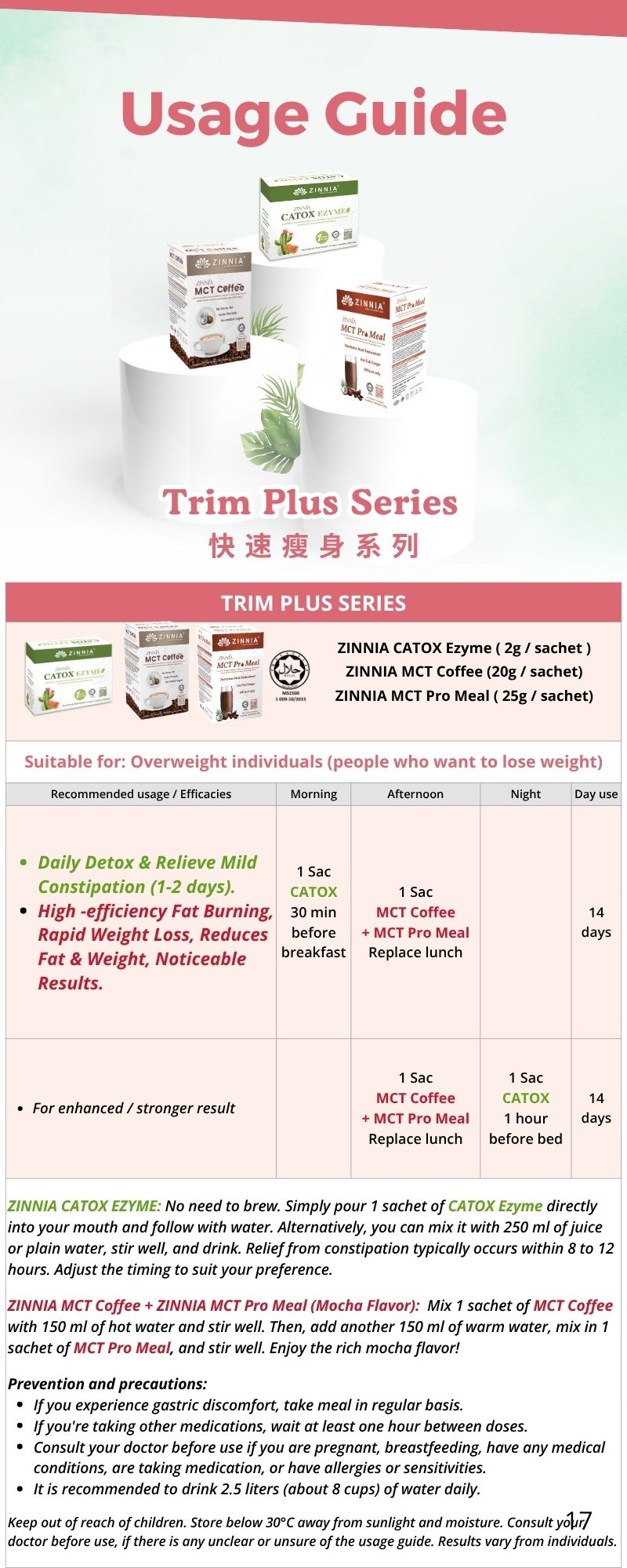 For more noticeable weight loss effects, it's recommended to undergo a 3-month treatment with ZINNIA Products. For individuals classified as obese (BMI index above 28), suggest taking ZINNIA Ultimate Detox Burn Fat Combo (ZINNIA CATOX EZYME + ZINNIA MCT Coffee + ZINNIA MCT Pro Meal.)