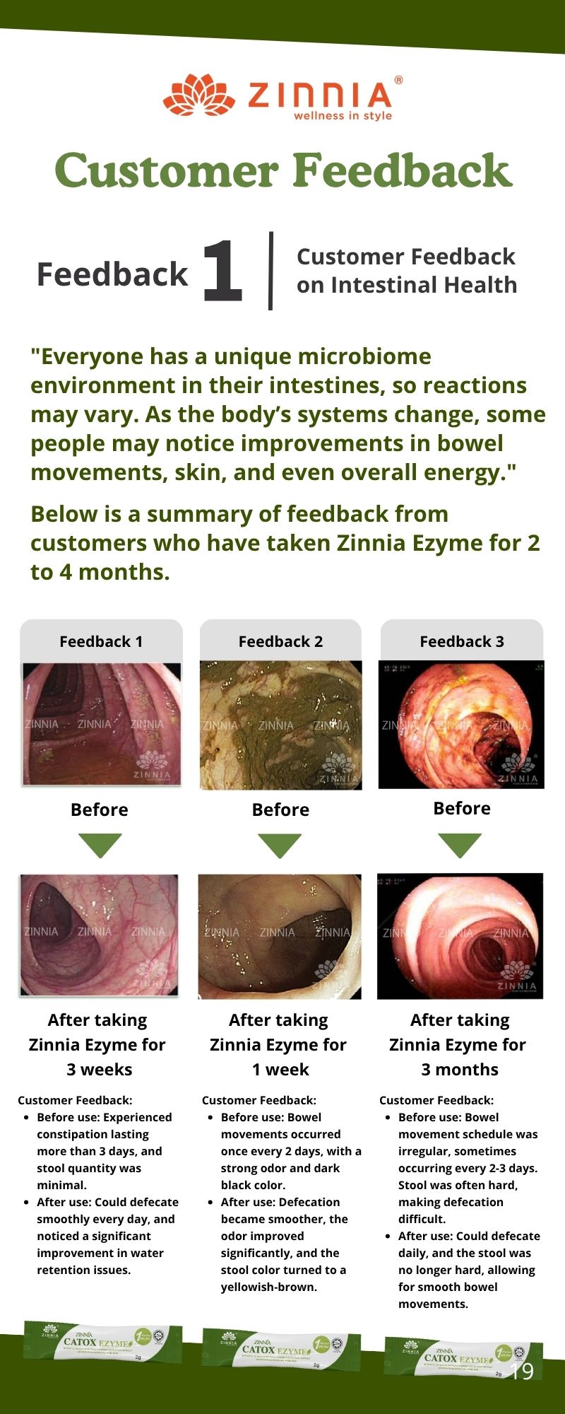 For individuals who have been troubled by chronic constipation, if your diet still lacks sufficient nutrition and fiber, discontinuing the use of ZINNIA CATOX EZYME may result in inadequate nutrient intake and a gradual decline in gastrointestinal motility, leading to a return to your previous bowel movement state. Overtime, toxins and fecal matter can accumulate once again. Therefore, after achieving the desired results, it is recommended to continue taking 1 sachet of ZINNIA CATOX EZYME every days to supplement the body with essential enzymes and maintain a healthy physique.