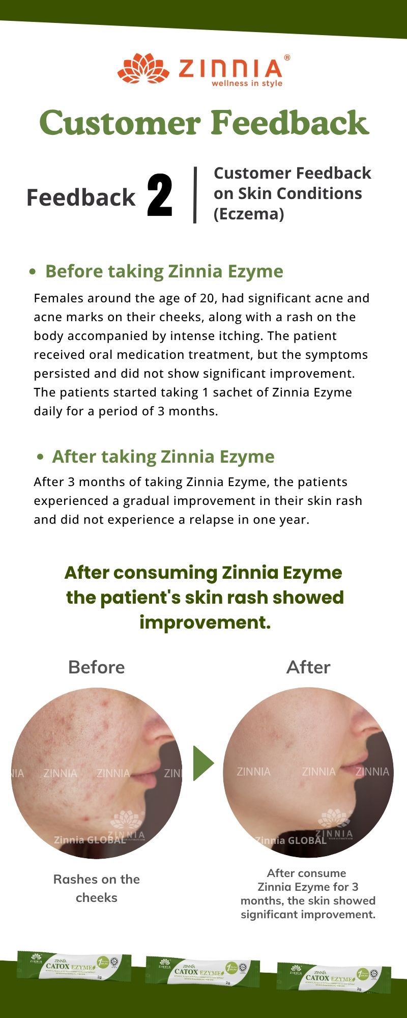 This condition is usually experienced at the beginning of the consumption period or may occur after consuming spicy or heavy foods. It’s recommended to continue using ZINNIA CATOX EZYME to help regulate your body. During this period, drinking plenty of warm water throughout the day (around 2.5 liters in small amounts) can aid in toxin metabolism. Once the toxins are eliminated, your bowel movements will return to normal, and the abdominal cramps will be relieved.