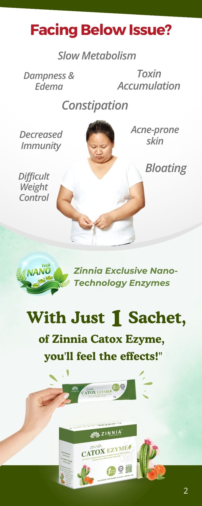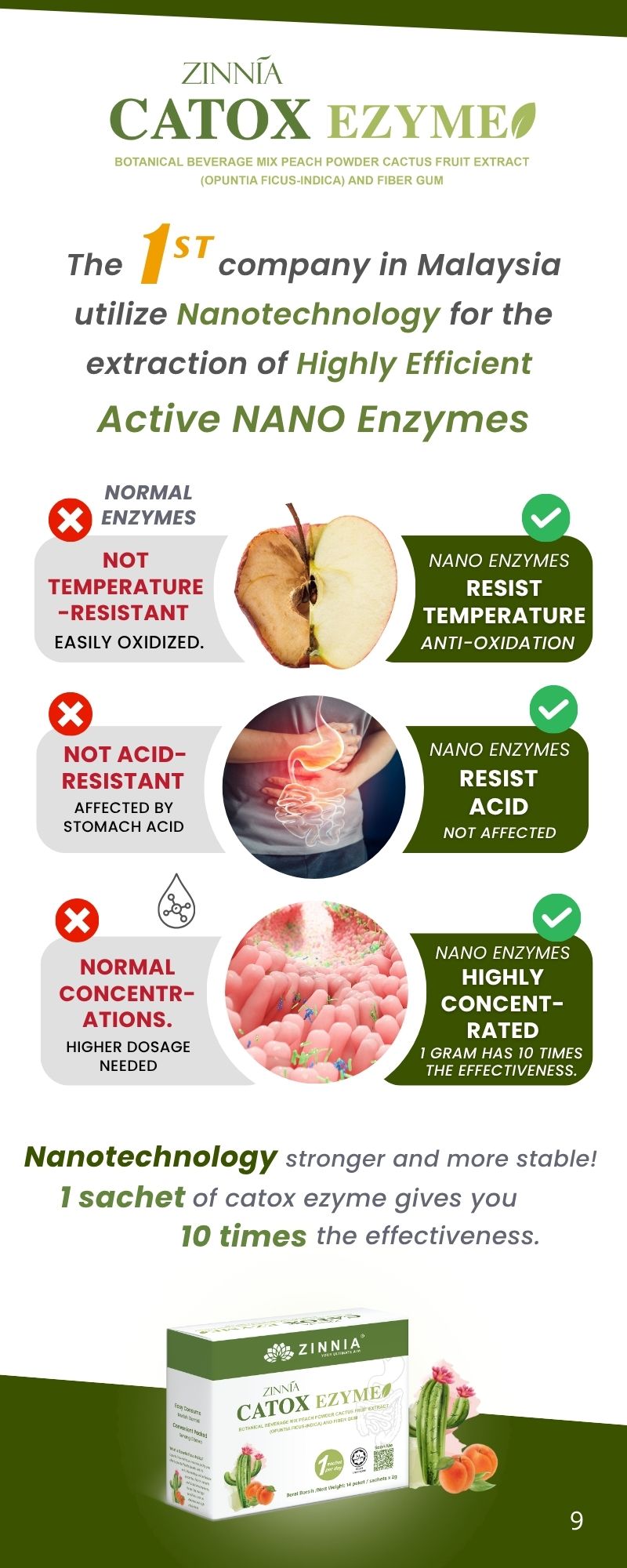 ZINNIA CATOX EZYME is a powerful natural nano enzyme crafted with advanced Japan NANO Technology. With just 1 sachet, this concentrated formula is highly effective, delivering 10 times the efficacy! Experience its remarkable benefits as it efficiently flushes out toxins and uric acid from your body, relieves constipation, and addresses concerns related to belly fat and obesity. Each sachet is individually packaged for your convenience, eliminating the need for brewing. Say goodbye to hassle and hello to a Simple and Effective solution!