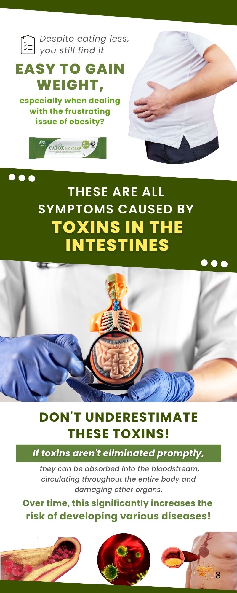 Adipose (fat) obesity is characterized by excess body fat, which can lead to inflammation, decreased organ function, and slow metabolism. To address this, it is recommended to combine ZINNIA MCT COFFEE and ZINNIA CATOX EZYME for better fat burning and detoxification effects. This combination helps burn visceral fat, improve inflammation, and accelerate metabolism, resulting in more significant weight loss.