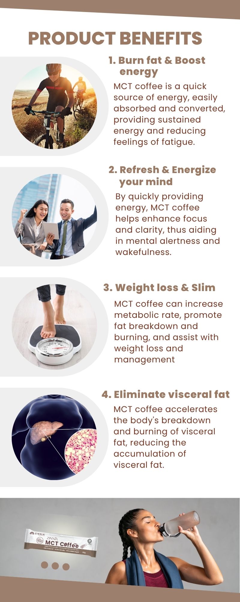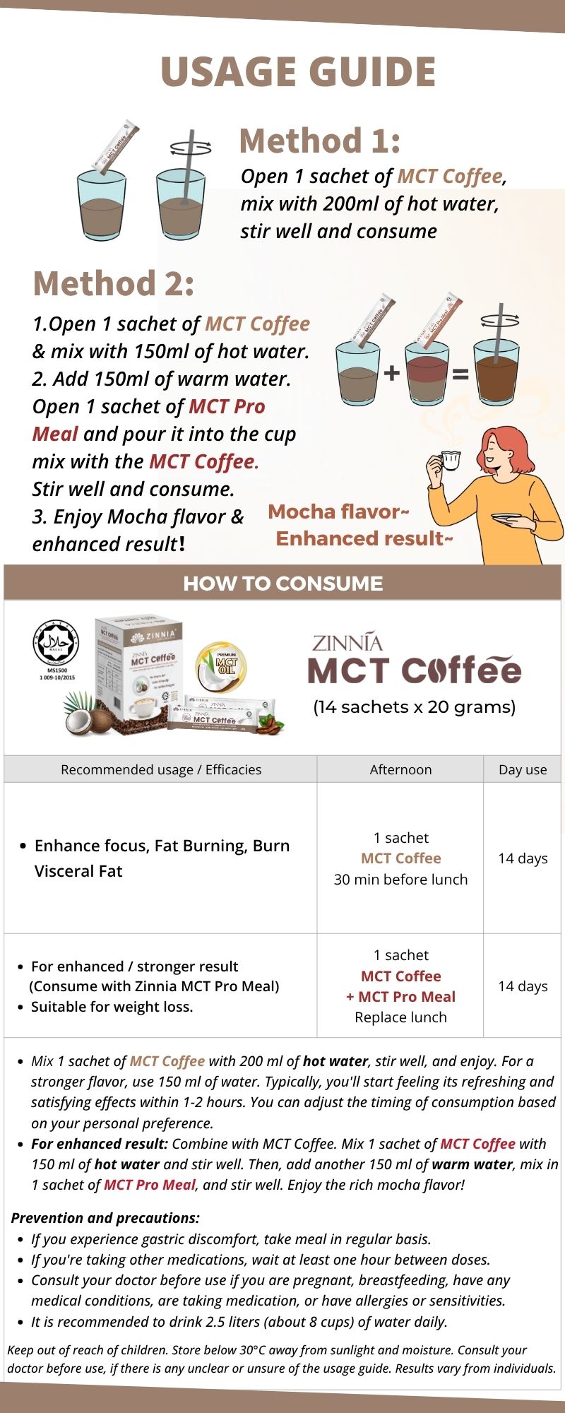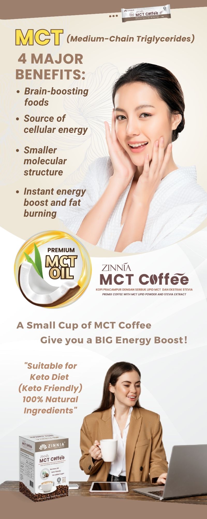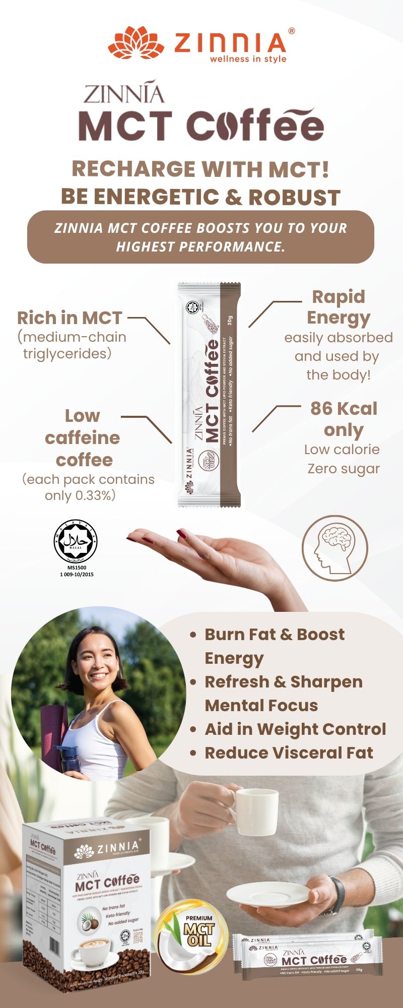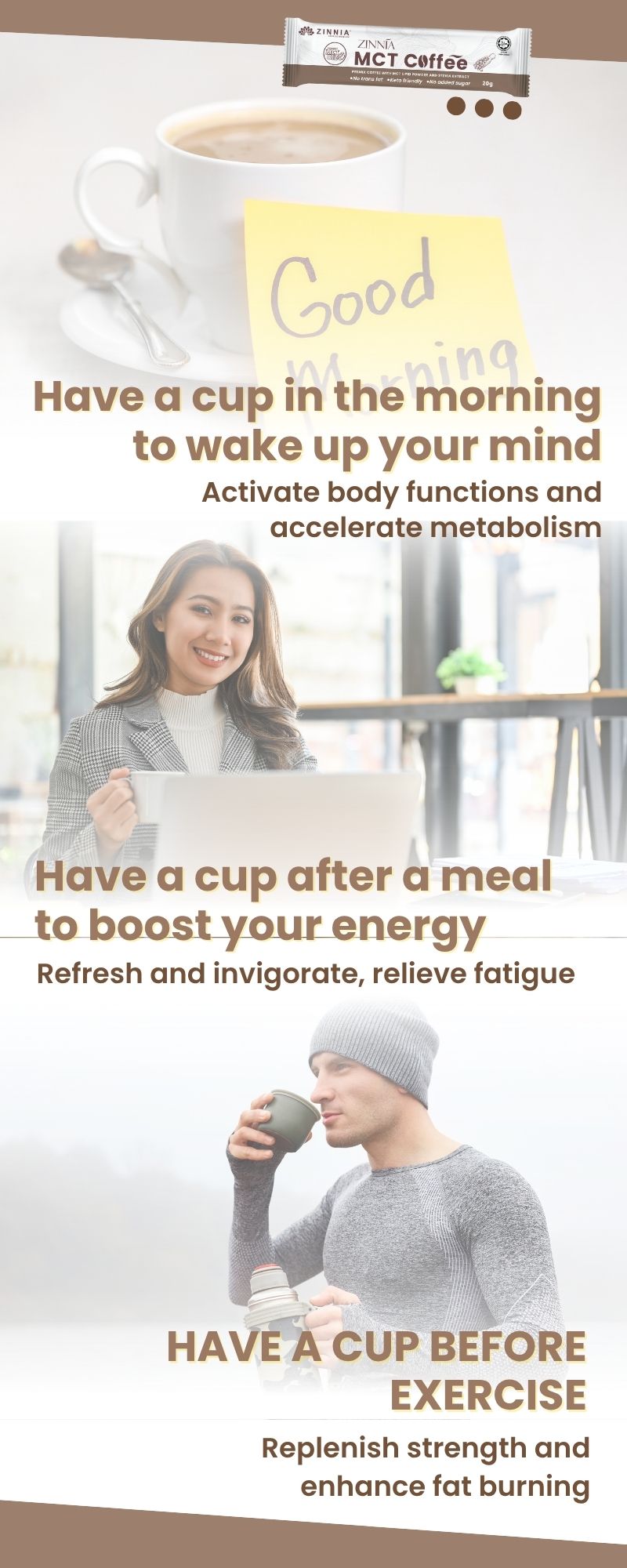 Since both coffee and MCT help to refresh the brain, improve concentration and memory, ZINNIA MCT Coffee helps to quickly replenish the energy needed by the brain, thereby helping to improve alertness, concentration, and reaction. Generally, the effects of refreshing the brain can be felt within 1 hour after drinking.
