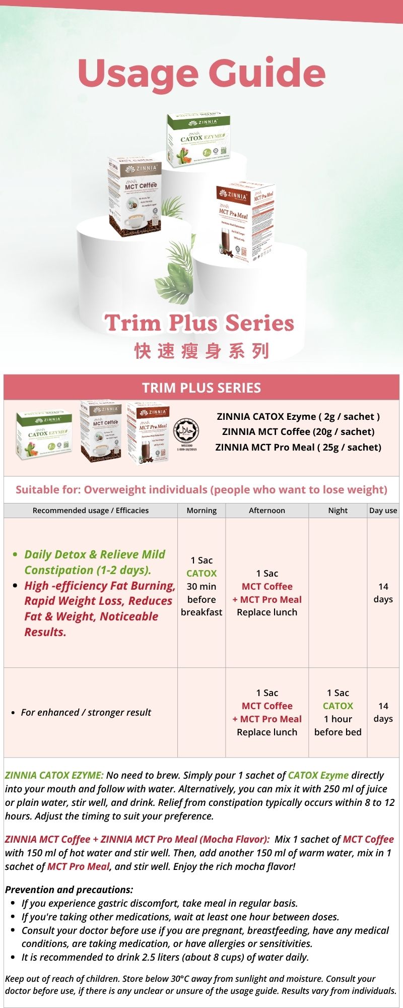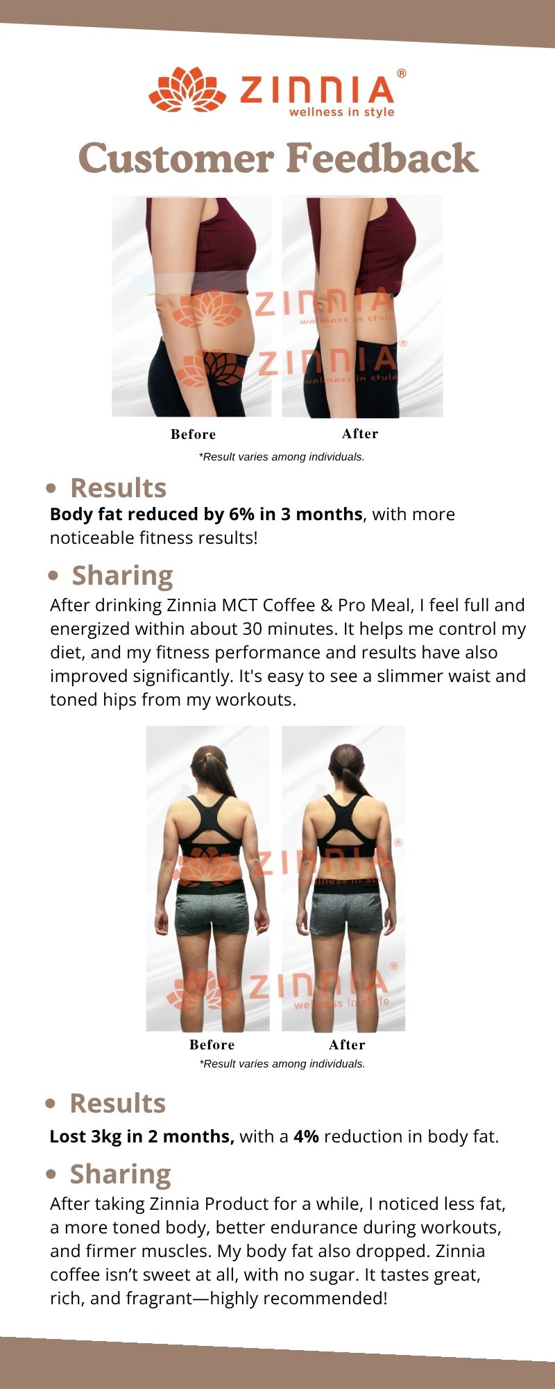 ZINNIA MCT Coffee is thought to promote fat burning, but it is not a standalone solution for weight loss. Effective weight loss typically requires a comprehensive diet and exercise plan. For more noticeable weight loss, fat loss and body shaping effect, suggest to consume together ZINNIA MCT Pro Meal and ZINNIA Enzymes (ZINNIA VTOX EZYME or ZINNIA CATOX EZYME).