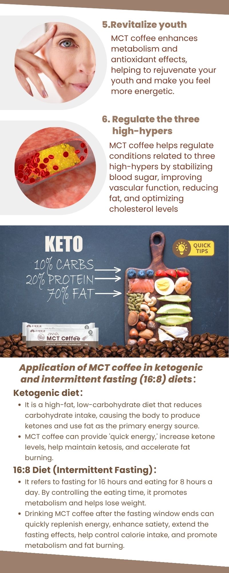 ZINNIA MCT Coffee is suitable for people with high blood sugar, high blood pressure and high cholesterol, as well as low-carb dieters, weight managers, athletes who need quick energy, office workers, people who care about intestinal health and people who promote brain health.