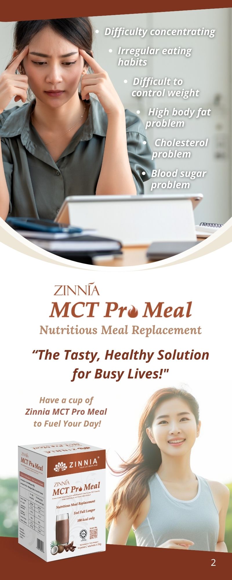 ZINNIA MCT Pro Meal is a great chocolate-flavored meal replacement for those wanting to lose weight, build muscle, or manage conditions like diabetes, high blood pressure, or high cholesterol. It’s made from natural ingredients, so it's safe for pregnant women too. However, if you have specific health conditions or take medication, it’s a good idea to consult your doctor before using it.