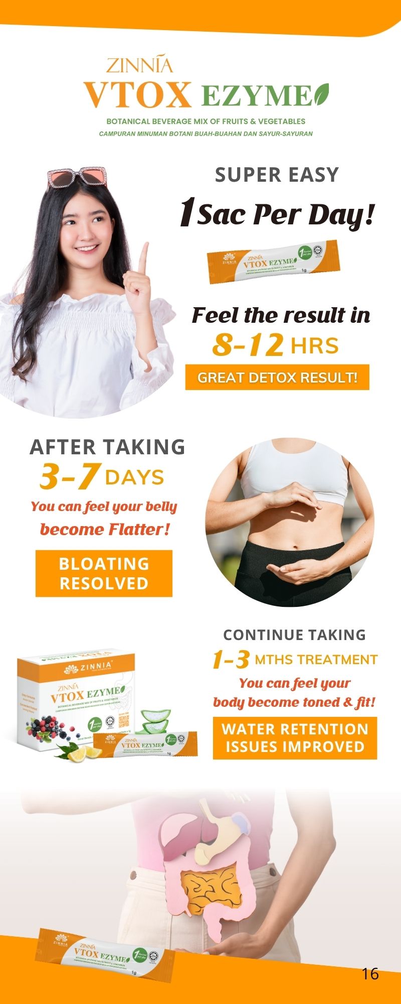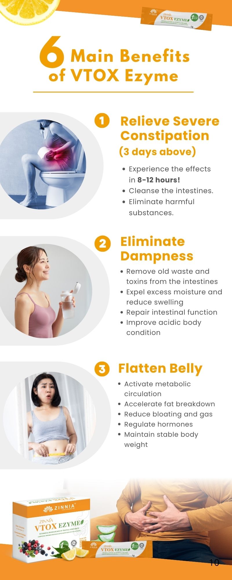 ZINNIA VTOX EZYME is designed to cleanse the intestines, effectively removing stubborn toxins and excess fat from the body while preserving essential nutrients. By softening and eliminating these harmful substances, ZINNIA VTOX EZYME can support you in achieving a healthier physique.