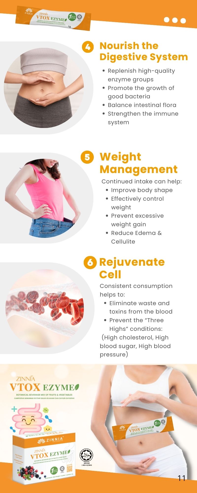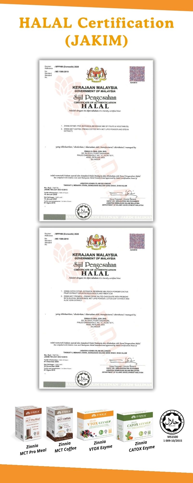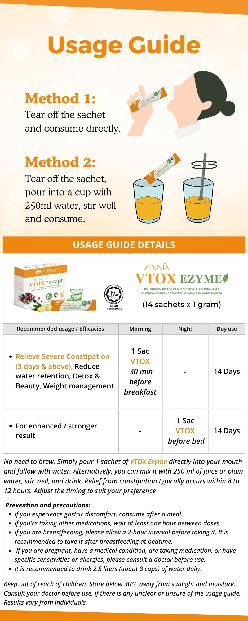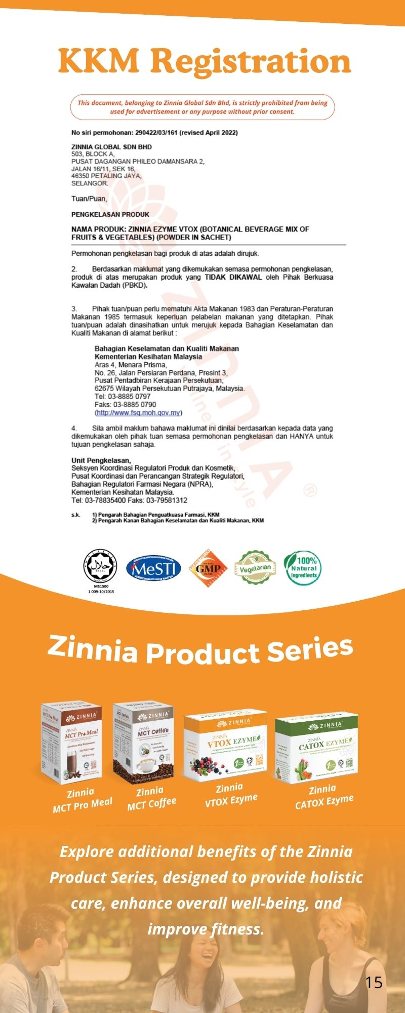 ZINNIA VTOX EZYME is made with a unique improved formula and high-quality enzymes, ensuring long-term consumption without side effects. It follows strict quality control guidelines, free from animal ingredients, harmful chemicals, and prohibited substances. It is tested, approved, and certified by the Ministry of Health Malaysia (KKM) and has been granted a HALAL certificate by the Department of Islamic Development Malaysia (JAKIM).
