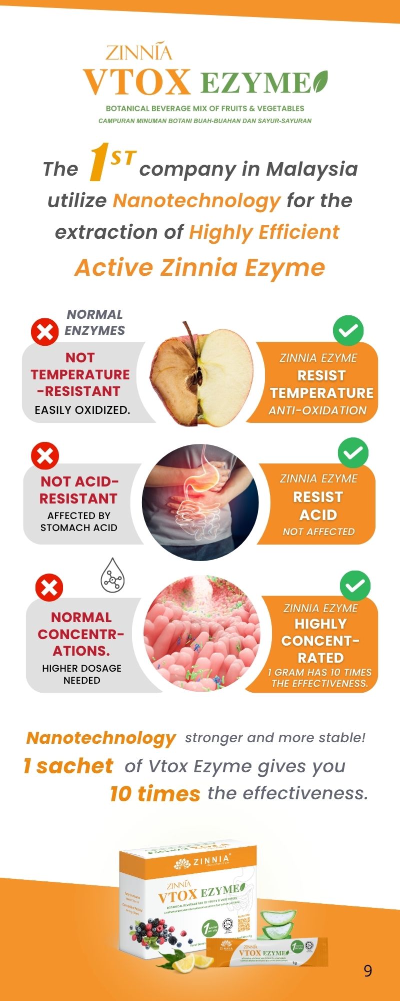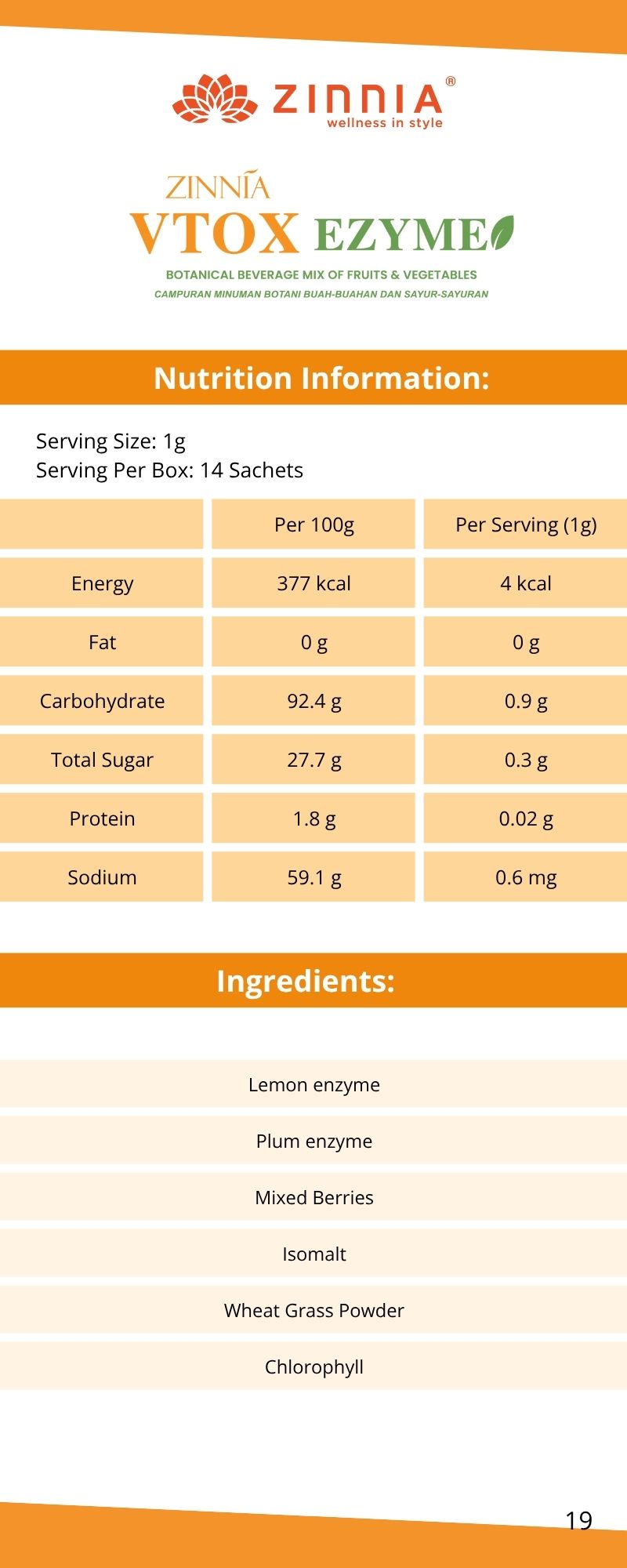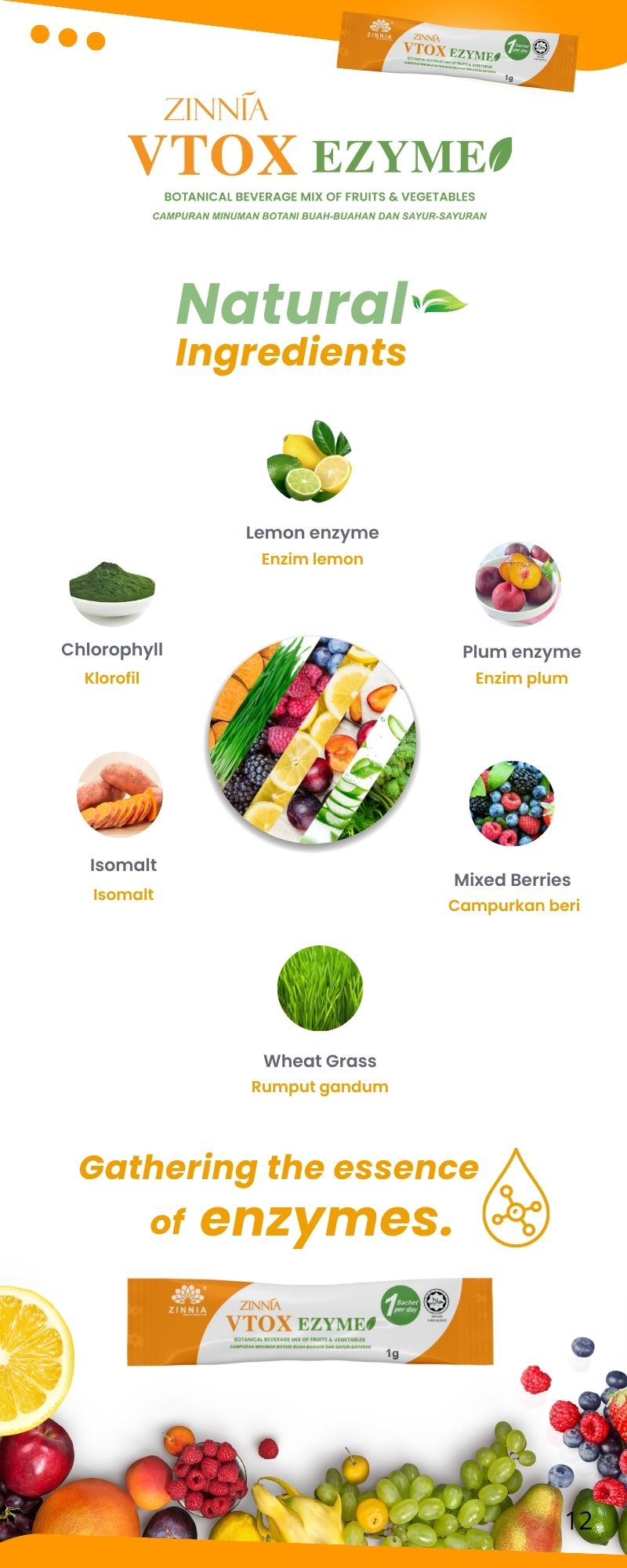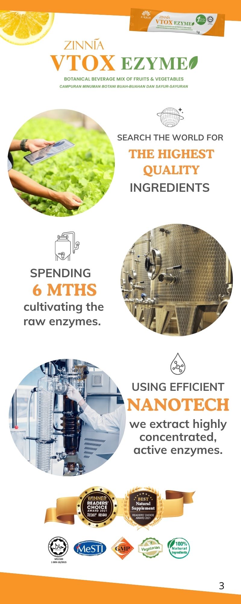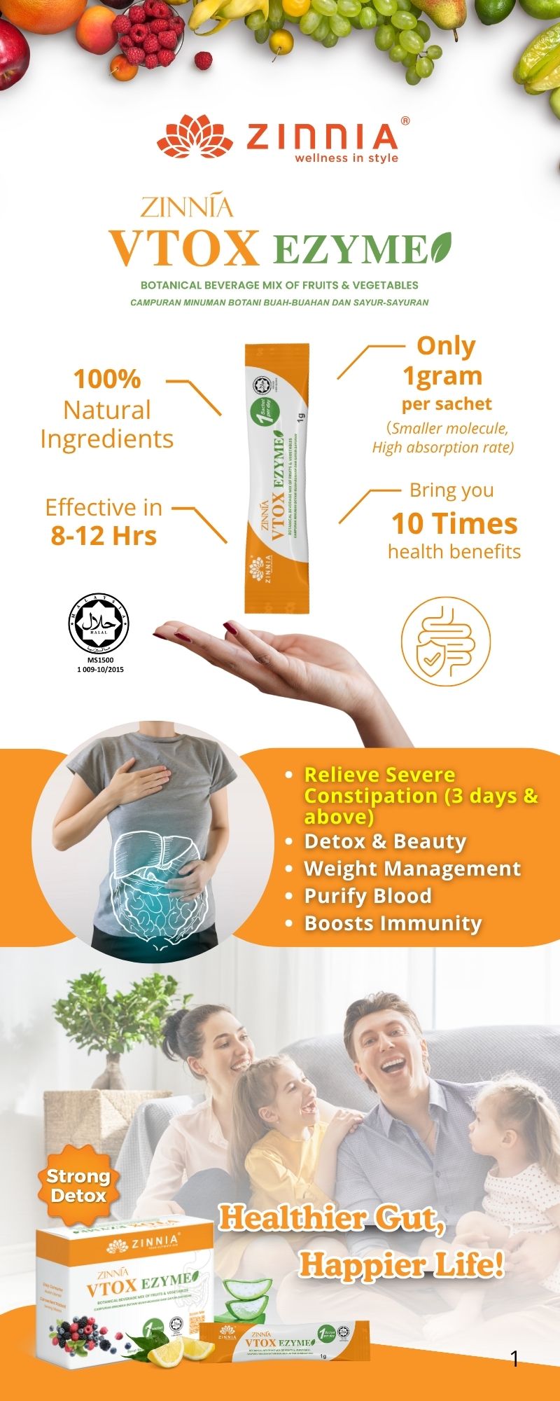 ZINNIA VTOX EZYME is made with a unique improved formula and high-quality enzymes, ensuring long-term consumption without side effects. It follows strict quality control guidelines, free from animal ingredients, harmful chemicals, and prohibited substances. It is tested, approved, and certified by the Ministry of Health Malaysia (KKM) and has been granted a HALAL certificate by the Department of Islamic Development Malaysia (JAKIM).