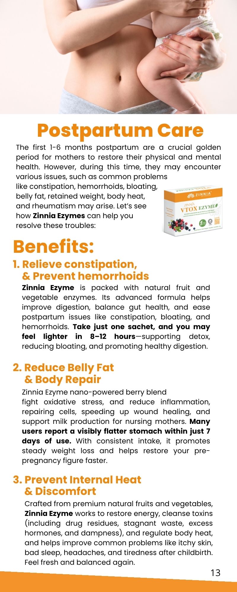 During the postpartum recovery period and while breastfeeding, it's crucial to take care of your body, especially when it comes to replenishing blood and maintaining a balanced diet. A balanced diet, including high-quality protein, is recommended to support postpartum recovery and promote milk production. It is generally safe to take ZINNIA VTOX EZYME in moderate amounts during the postpartum recovery period. However, for breastfeeding mothers, it is advised to wait for a 2-hour interval between taking ZINNIA VTOX EZYME and breastfeeding.