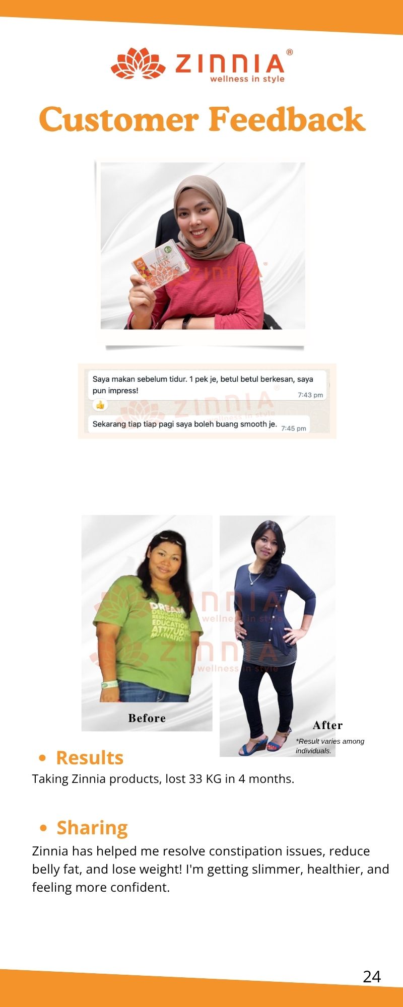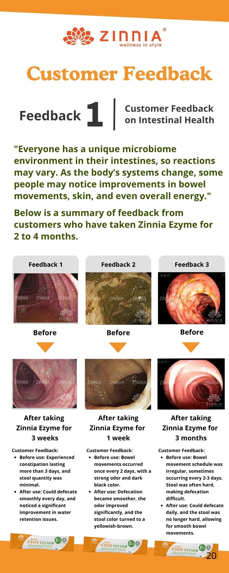 For individuals who have been troubled by chronic constipation, if your diet still lacks sufficient nutrition and fiber, discontinuing the use of ZINNIA VTOX EZYME may result in inadequate nutrient intake and a gradual decline in gastrointestinal motility, leading to a return to your previous bowel movement state. Overtime, toxins and fecal matter can accumulate once again. Therefore, after achieving the desired results, it is recommended to continue taking 1 sachet of ZINNIA VTOX EZYME every days to supplement the body with essential enzymes and maintain a healthy physique.