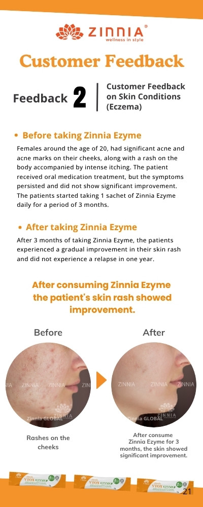 ZINNIA VTOX EZYME helps promote intestinal motility to achieve natural detoxification effects. If you are just starting to take it and there is a buildup of fecal matter or toxins in your body, you may experience strong gastrointestinal motility, which can be mistaken for abdominal cramps or frequent bowel movements. Generally, these symptoms will ease after defecation. This condition is usually experienced at the beginning of the consumption period or may occur after consuming spicy or heavy foods. It’s recommended to continue using ZINNIA VTOX EZYME to help regulate your body. During this period, drinking plenty of warm water throughout the day (around 2.5 liters in small amounts) can aid in toxin metabolism. Once the toxins are eliminated, your bowel movements will return to normal, and the abdominal cramps will be relieved.