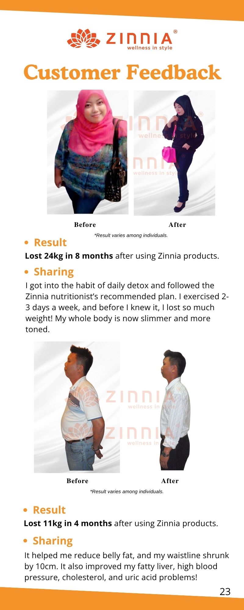 Results vary for each person, but typically you'll experience the effects of promoting bowel movements within 8-12 hours after taking ZINNIA VTOX EZYME. Once issues like faecal impaction and constipation improve, you'll notice a reduction in belly fat, bloating, and edema within 3-7 days. Continuously taking it for 2-4 weeks may lead to noticeable changes in your body shape.