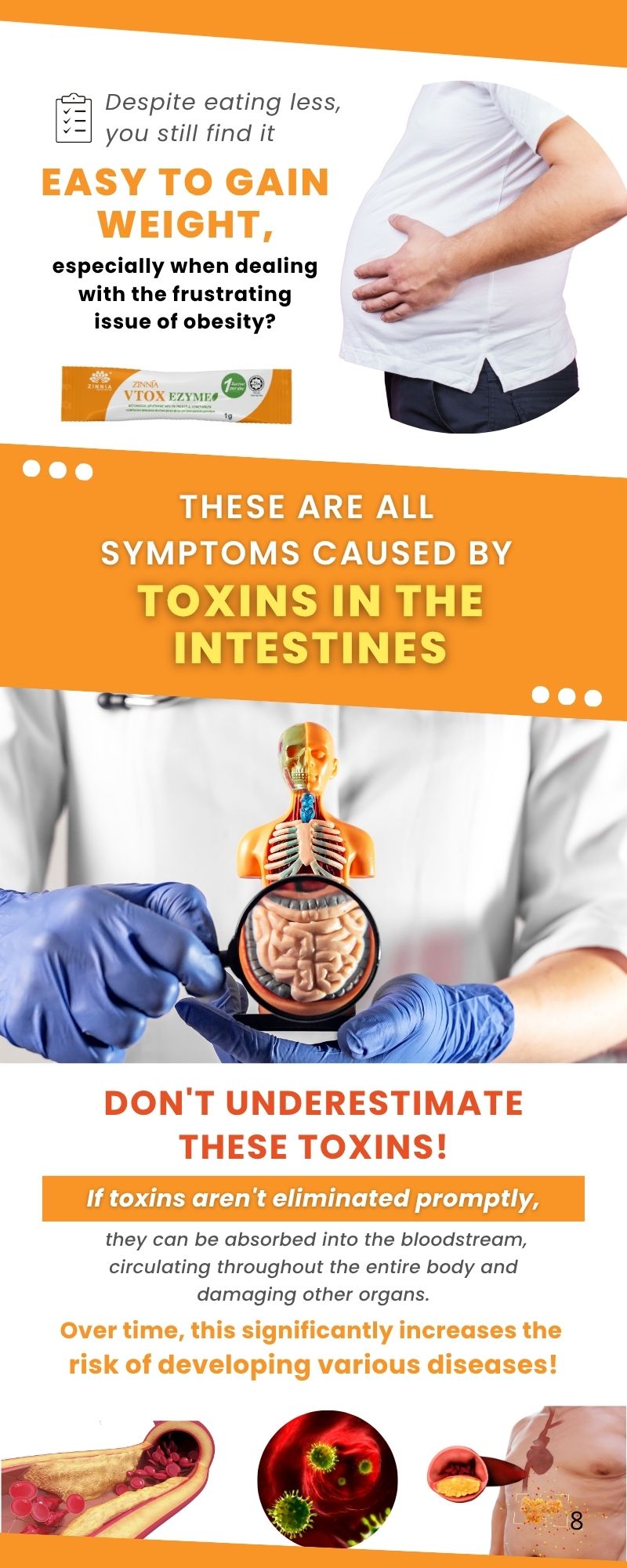 ZINNIA VTOX EZYME catalyzes the breakdown of food, aiding the small intestine in absorbing more nutrients and reducing intestinal burden. As the body’s nutrient absorption efficiency significantly improves, it gains more energy and nutrients, including starch, protein, and fat, which might cause a temporary increase in weight/body fat.